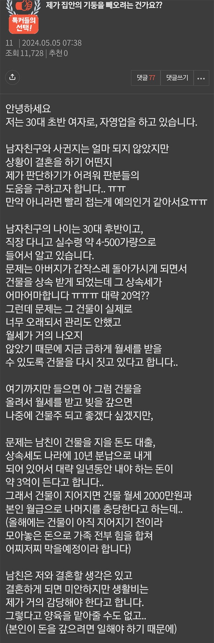 사연 속 주인공은 남자친구와 결혼을 고민하고 있는데, 그 이유는 바로 상속받은 건물과 관련된 재정 문제 때문입니다. 듣기만 해도 복잡한 상황인데요. 남자친구가 건물을 상속받으면서 생긴 **막대한 상속세(약 20억)**와 관리 문제로 인해 결혼 후 주인공에게까지 경제적 부담이 전가될 가능성이 있어 걱정하고 있다고 합니다.