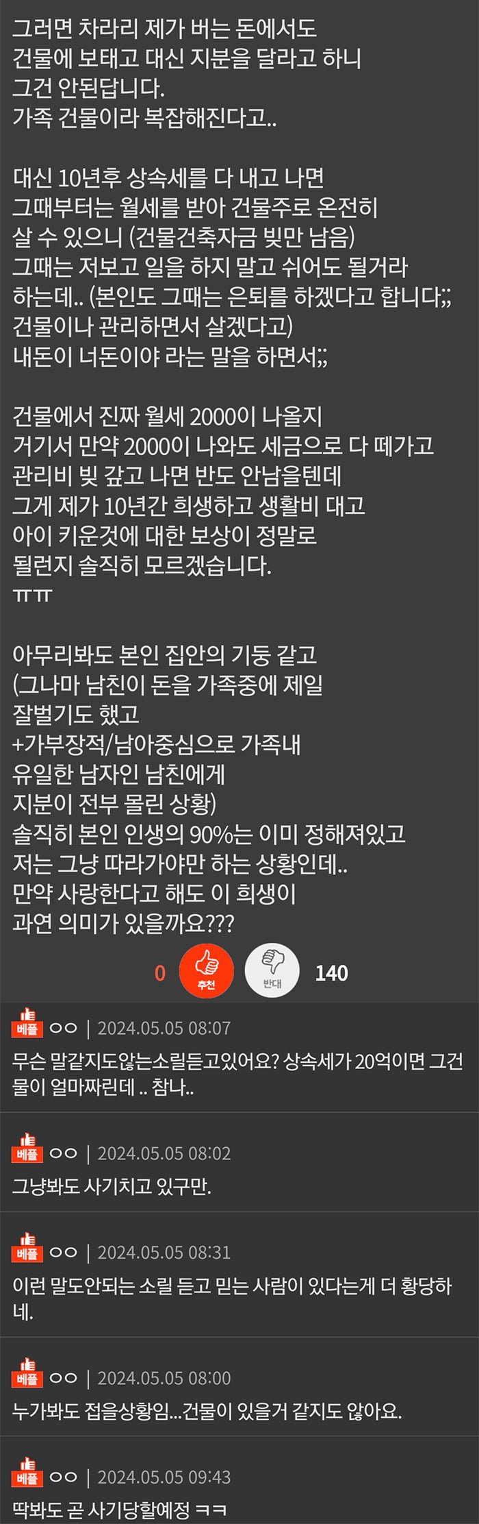남자친구가 상속받은 건물이 실제로 가치가 있는지조차 불확실하다는 점에서 경고의 목소리가 많습니다. - "현실적으로 답이 없는 상황"
