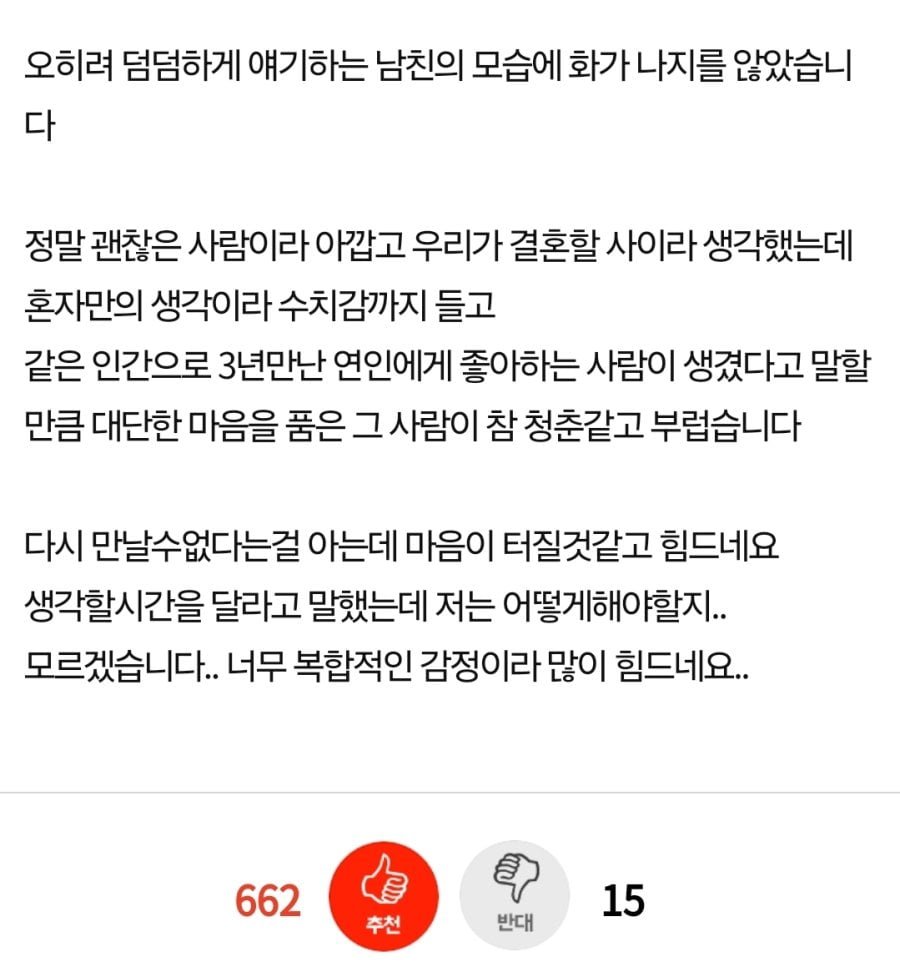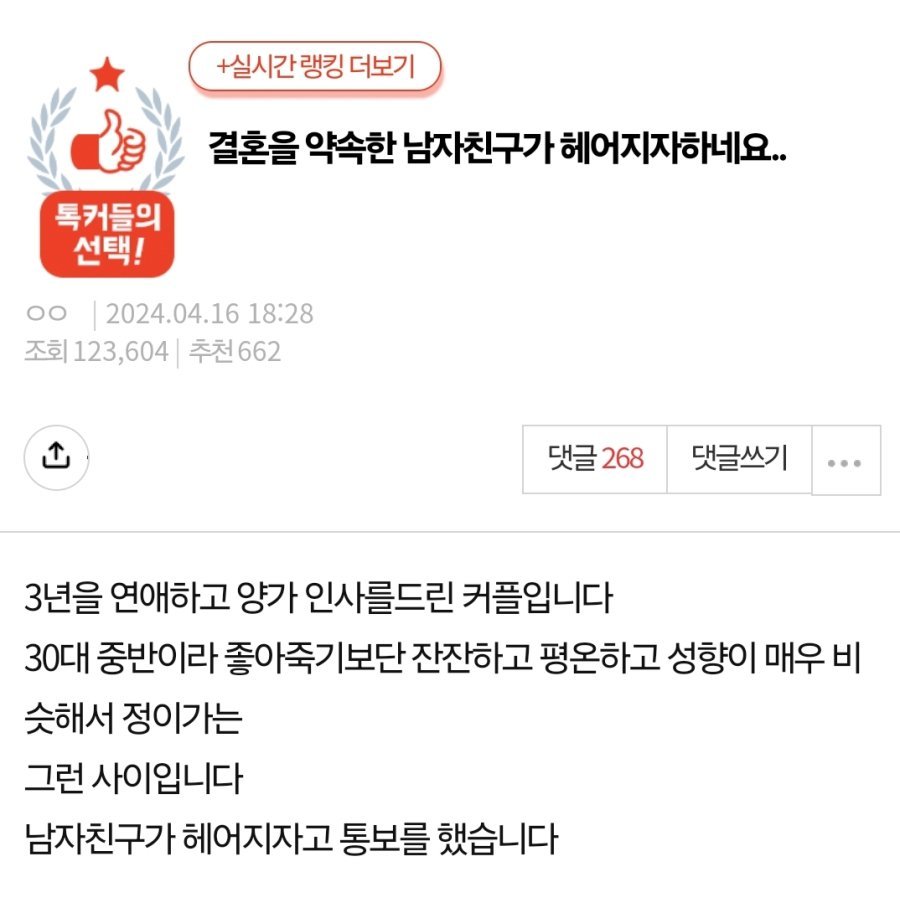 3년 동안 연애하고 양가 인사까지 마친 커플이 결혼을 앞두고 남자친구의 갑작스러운 이별 통보를 받았다는 사연이 화제가 되고 있습니다. 평온하고 안정적인 관계를 유지했던 만큼, 이별의 이유에 대해 더욱 충격적이고 의문스럽다는 반응이 이어지고 있는데요.