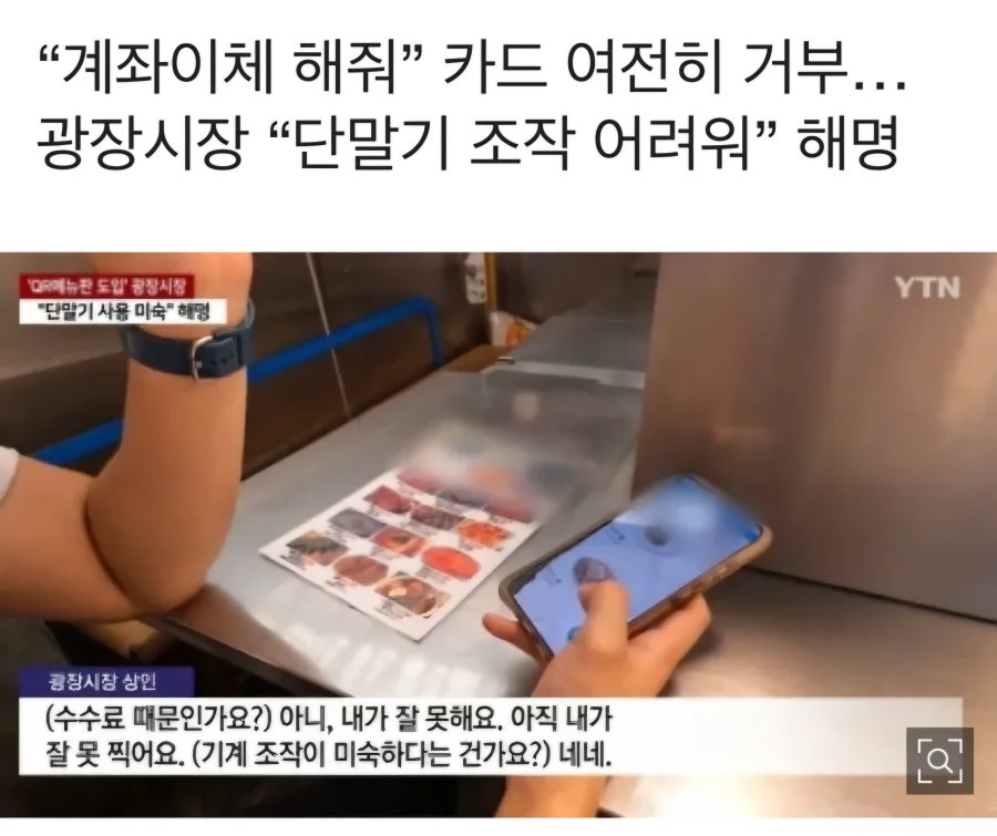 일반적으로 카드 결제를 거부하는 이유는 수수료 부담 때문이라는 의견이 많지만, 이번에는 다른 이유가 나왔습니다. 광장시장의 일부 상인들은 "단말기 조작이 어려워서" 라는 해명을 내놓았다고 하네요.