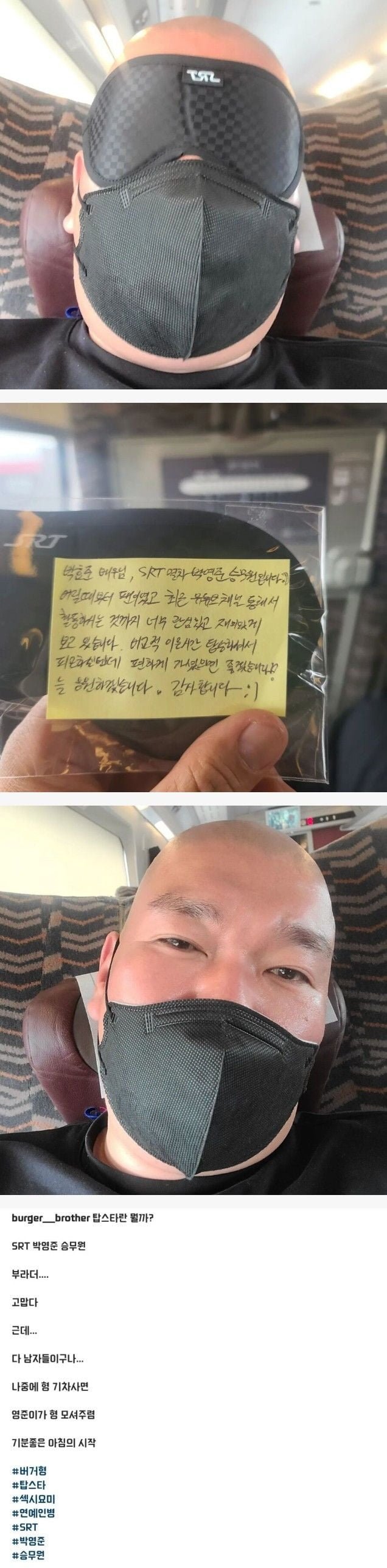 버거형, 이번엔 SRT 탑승 중 특별한(?) 경험을 했네요! 기차 안에서 승무원들의 깜짝 쪽지를 받은 모습이 공개되었는데요. 노란 메모지에 정성스럽게 적힌 내용이 정말 훈훈합니다. 😊