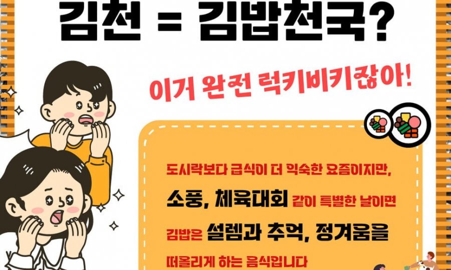 김천에서는 김밥이 단순한 음식이 아니라 설렘과 추억, 정겨움을 담은 특별한 음식이라고 강조하며 김밥축제를 열었다. 학창 시절 소풍이나 운동회 때 빠지지 않던 김밥! 요즘은 급식이 더 익숙하지만, 특별한 날에는 김밥이 빠질 수 없지!