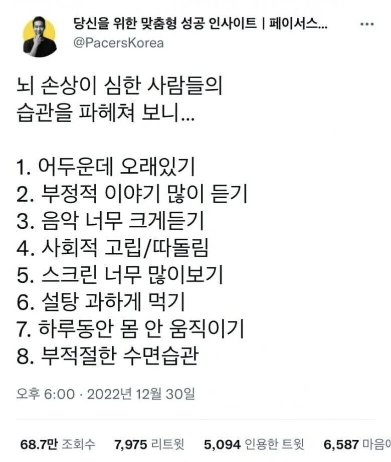 위 이미지는 뇌 건강을 해치는 8가지 습관을 나열한 것으로, 많은 사람들이 공감하며 반성하게 만드는 내용이에요. 이런 행동들이 뇌에 영향을 미칠 수 있다니, 작은 습관 하나라도 신경 써야 할 것 같네요. 😥