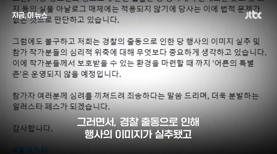 - 경찰 조사 결과, 성인 인증을 거친 전시였기에 법적으로 문제는 없었다고 판단됨.