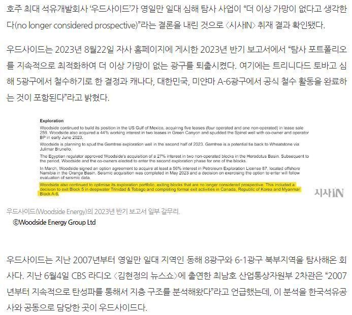 호주 최대 석유개발회사 ‘우드사이드’가 영일만 일대 심해 탐사 사업이 “더 이상 가망이 없다고 생각한다(no longer considered prospective)”라는 결론을 내린 것으로 〈시사IN〉 취재 결과 확인됐다.우드사이드는 2023년 8월22일 자사 홈페이지에 게시한 2023년 반기 보고서에서 “탐사 포트폴리오를 지속적으로 최적화하여 더 이상 가망이 없는 광구를 퇴출시켰다. 여기에는 트리니다드 토바고 심해 5광구에서 철수하기로 한 결정과 캐나다, 대한민국, 미얀마 A-6광구에서 공식 철수 활동을 완료하는 것이 포함된다”라