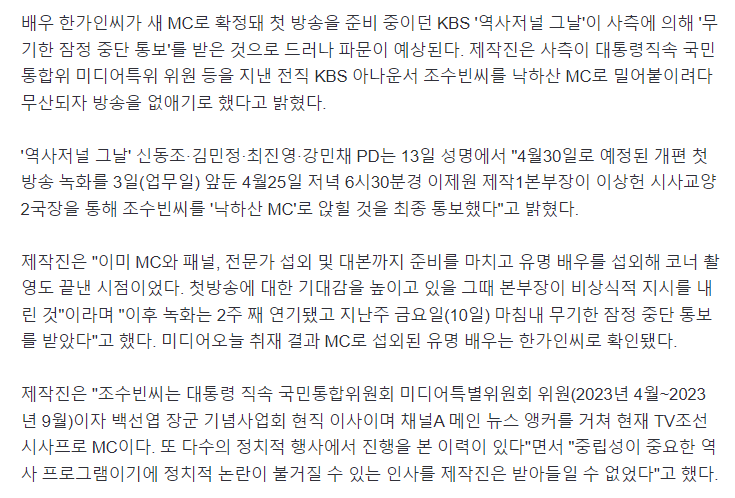 배우 한가인씨가 새 MC로 확정돼 첫 방송을 준비 중이던 KBS '역사저널 그날'이 사측에 의해 '무기한 잠정 중단 통보'를 받은 것으로 드러나 파문이 예상된다. 제작진은 사측이 대통령직속 국민통합위 미디어특위 위원