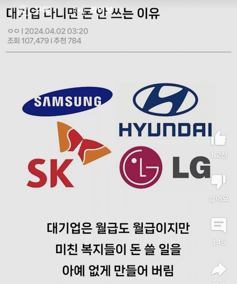 이 외에도 건강검진, 콘도 이용권, 경조사비, 자기 계발비 지원 등 다양한 복지 혜택이 제공됩니다. 회사에서 제공하는 다양한 혜택 덕분에 직원들이 월급을 거의 쓰지 않고도 생활이 가능한 수준이라고 하니, 대기업의 복지가 얼마나 철저한지 실감이 나네요.