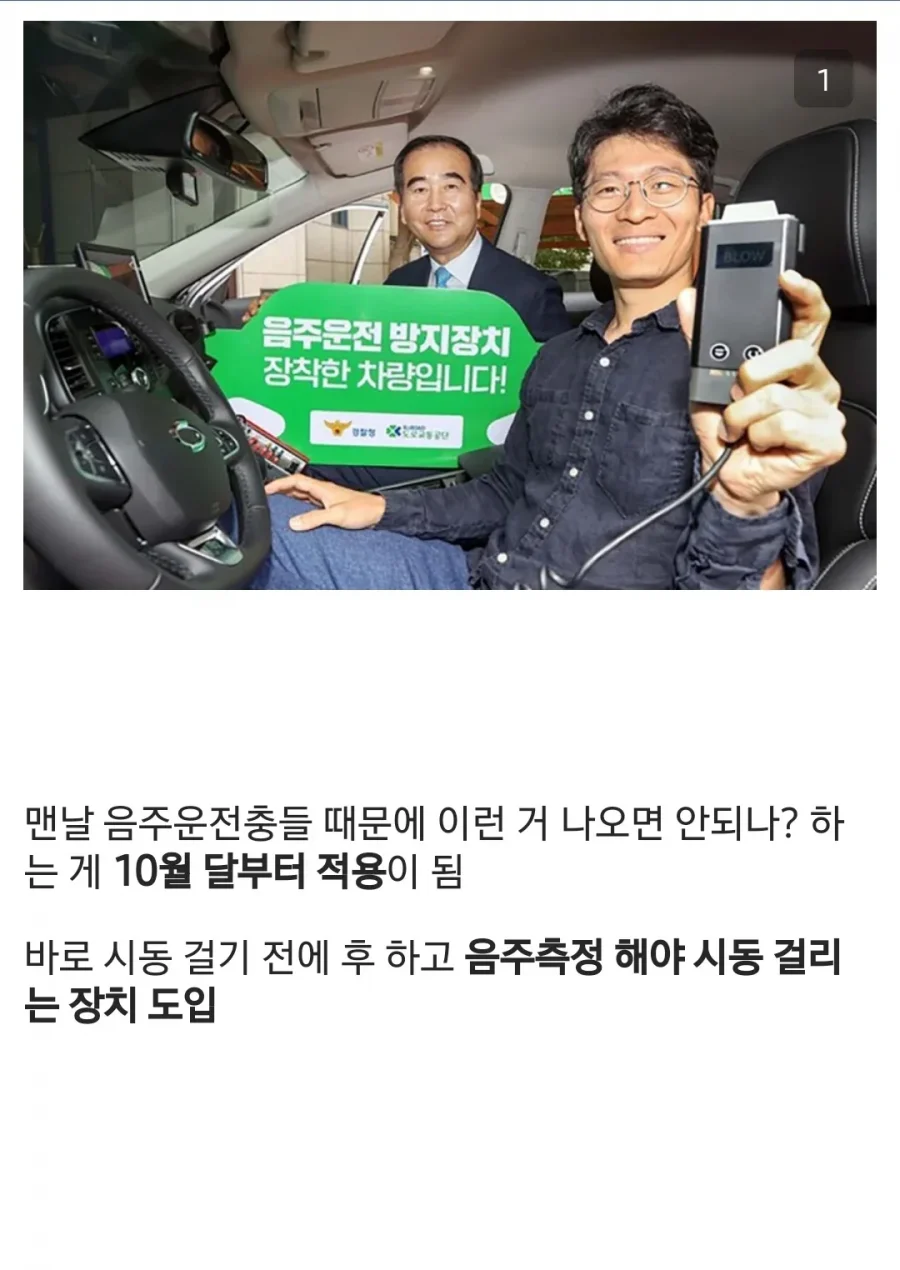 10월부터 음주운전 방지장치가 도입되면서, 운전자는 시동을 걸기 전 반드시 음주 측정을 해야 하는데요. 🍺❌ 측정 결과가 기준치를 초과하면 시동이 걸리지 않는 시스템입니다.