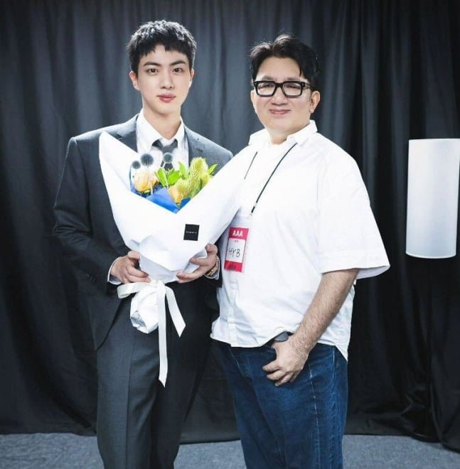 방시혁 하이브 의장이 그룹 방탄소년단(BTS) 멤버 진의 전역 행사에 참석한 사진을 소셜미디어(SNS) 계정에 공개했다. 민희진 어도어 대표와 ‘경영권 탈취’ 문제로 분쟁을 벌인 이후 첫 근황이