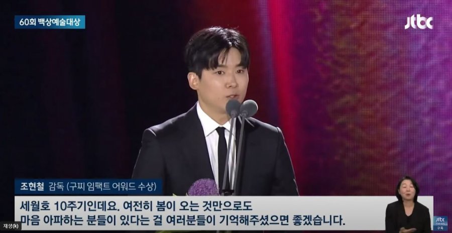 "지금 저희 아버지가 투병 중이세요. 아마 진통제를 맞고 시상식을 보고 계실지는 모르겠는데 이런 자리에서 사적인 이야기를 하게 될 줄은 몰랐네요. 좀 지루할 수도 있겠지만 죽음을 앞둔 아버지에게 조금 용기를 드리고자 잠시 시간을 할애하겠습니다.