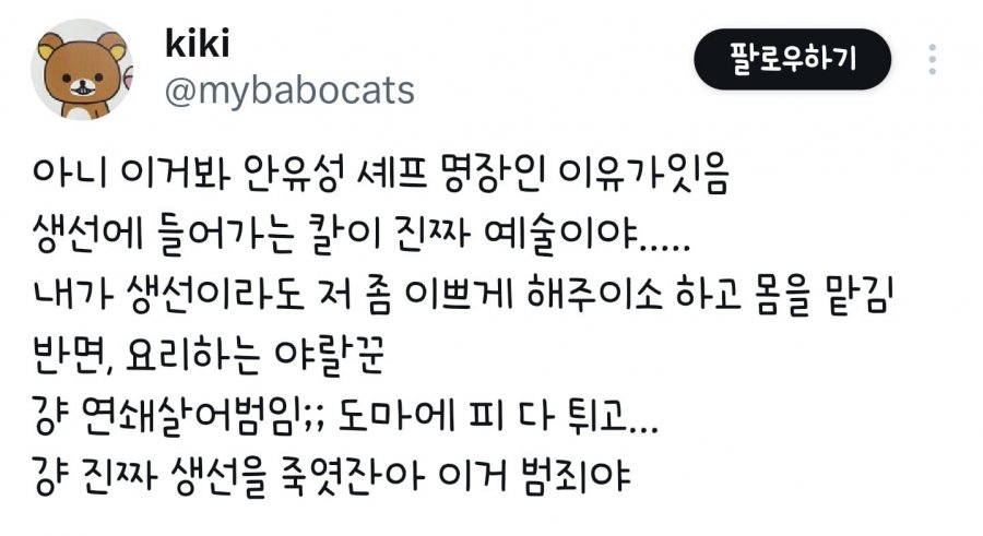 같은 칼질로 요리를 시작하면 "야알꿍! 강 연쇄살X범임;;"이라는 웃픈 반응이 이어지며 웃음을 자아냈습니다. 도마에 피(?)가 튄다며 생선 손질이 너무 완벽해 **"진짜 생선을 죽였다, 이건 범죄"**라는 댓글까지!
