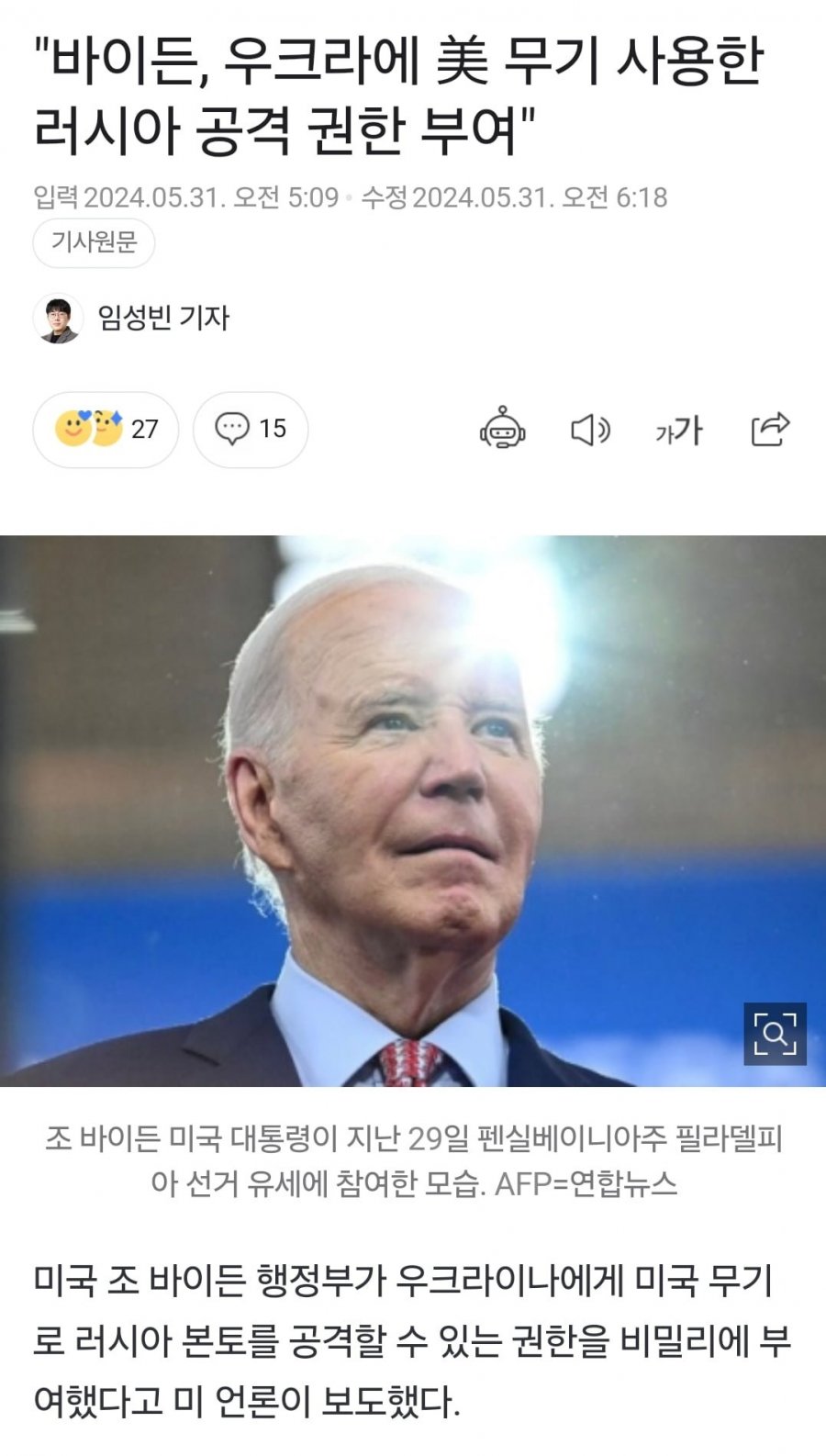 미국 조 바이든 행정부가 우크라이나에게 미국 무기로 러시아 본토를 공격할 수 있는 권한을 비밀리에 부여했다고 미 언론이 보도했다. 30일(현지시간) 미 정치전문매체 폴리티코는 사안에 정통한 미국 관료가 “바이든 대통