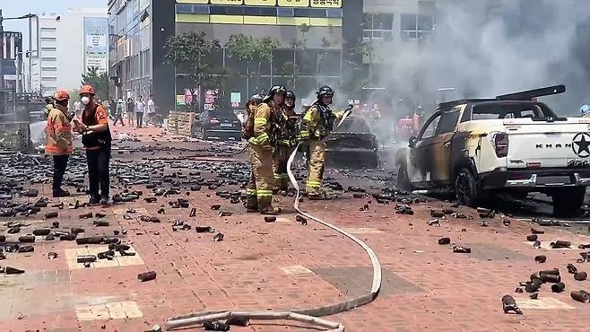 부산 한 마트서 부탄가스 연쇄폭발…차량 불타고 아수라장(종합)