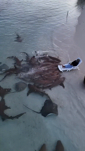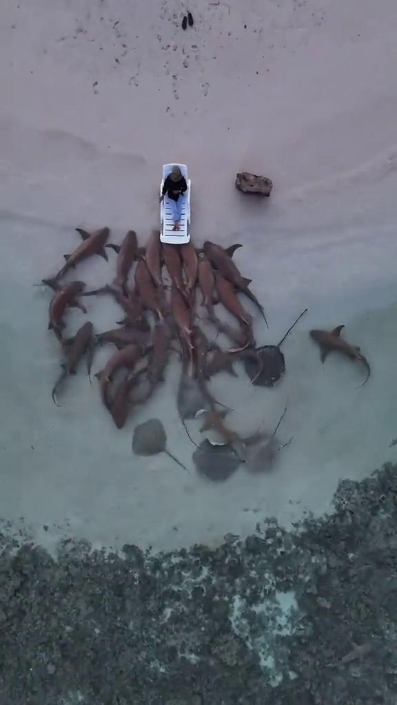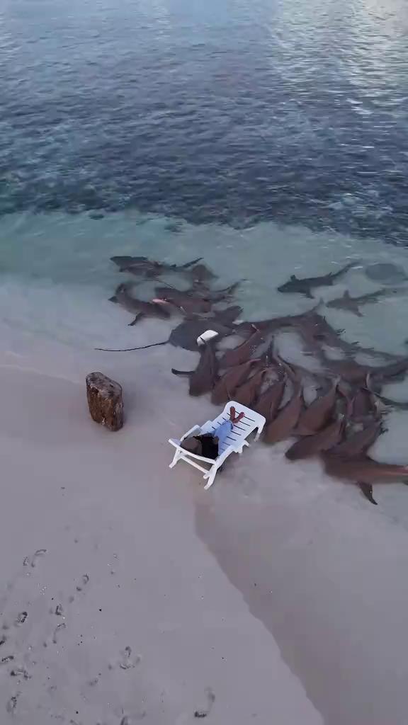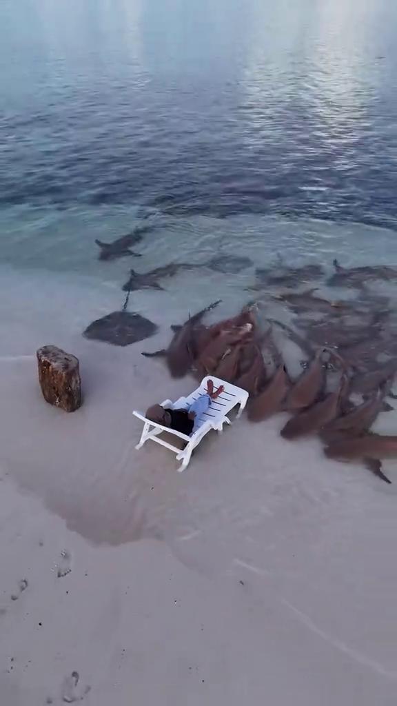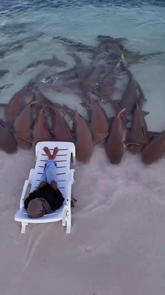 해변에서 평온하게 휴식을 취하는 사람 앞에 상어와 가오리 떼가 몰려드는 놀라운 장면입니다! 🦈✨ 몰디브는 자연과 가까운 휴양지로 유명한데, 이렇게 가까이에서 야생 해양 생물을 만날 수 있다니 정말 신기하네요.
