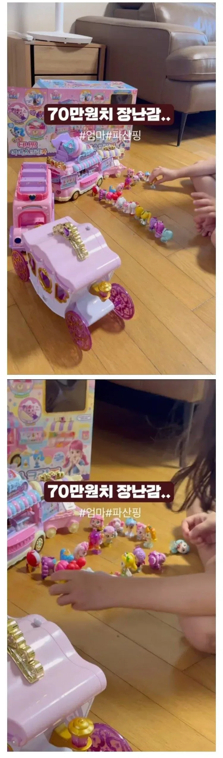 사진 속 장난감, 보셨나요? 앙증맞은 캐릭터들과 화려한 마차 세트! 그런데 그 가격이 무려 70만 원이라고 합니다. 😲 부모님들, 심호흡 한번 하셔야 할 것 같아요.