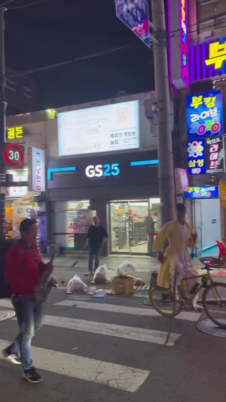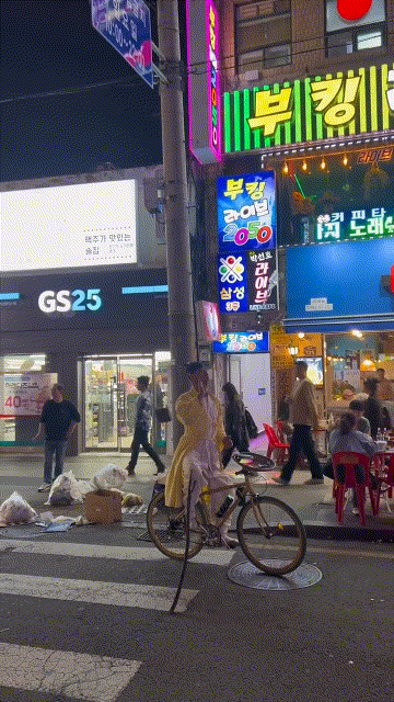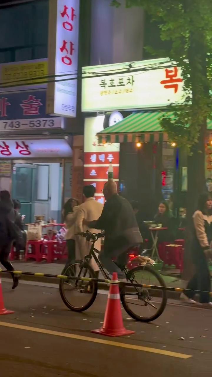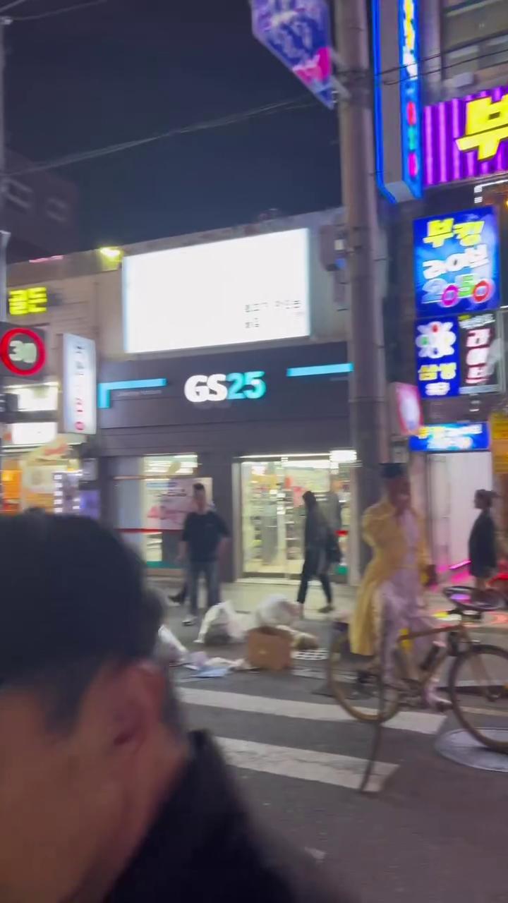 한밤중 종로 거리에서 자전거를 타고 등장한 한 사람… 근데 옷이 황금색 전신 수트?! 🤩✨ 뭔가 비범한 분위기를 풍기며 도로 한가운데에서 여유롭게 멈춰 있는 모습이 시선을 확 사로잡네요.