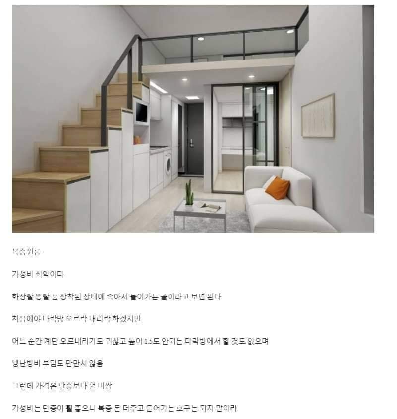 복층원룸의 경우는 전용면적에 복층이 포함되지 않기때문에 많은 오피스텔이나 원룸에서 시행한 방식입니다. 계약면적보다 훨씬 넓어보고 활용도가 좋은 면이 있어 많은 사람들이 복층형을 구입하지만 현실은