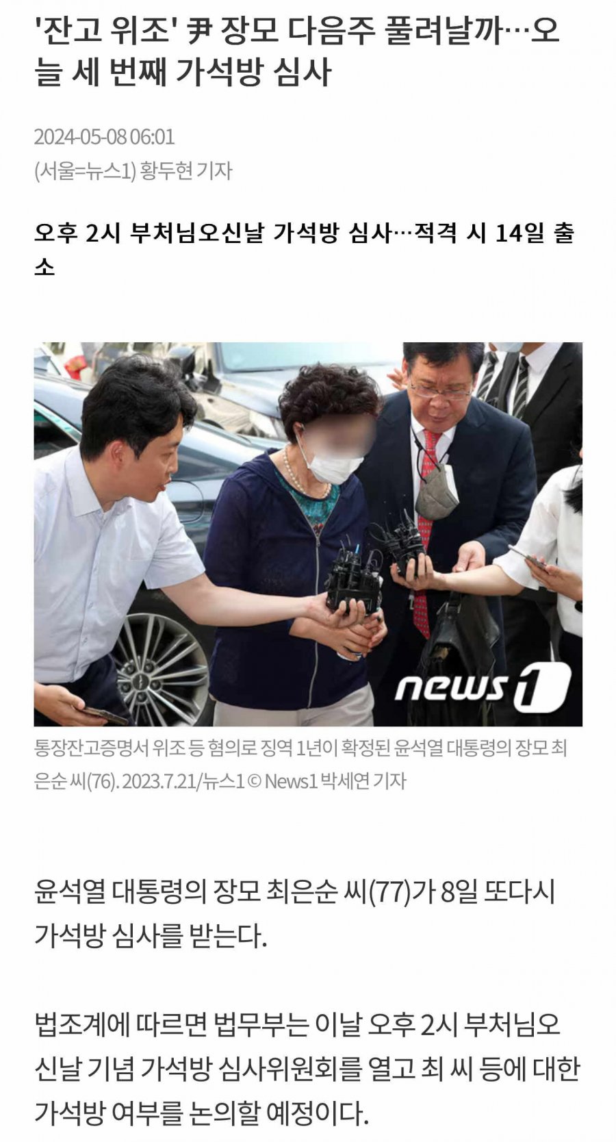 '잔고 위조' 尹 장모 다음주 풀려날까…오늘 세 번째 가석방 심사