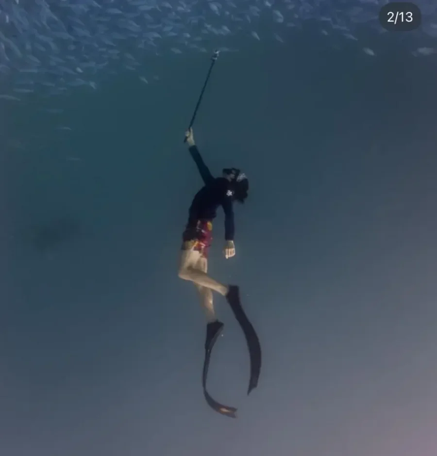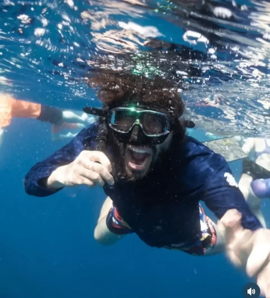 사진 속 그는 푸른 바다와 함께 신나는 시간을 보내고 있어요. 첫 번째 사진에서는 특유의 개성 넘치는 패션(핑크 운동화+빨간 가방+밀리터리 룩)으로 등장! 🏝️ 그리고 두 번째 사진에서는 스노클링하며 환한 미소를 짓고 있네요. 😆💦