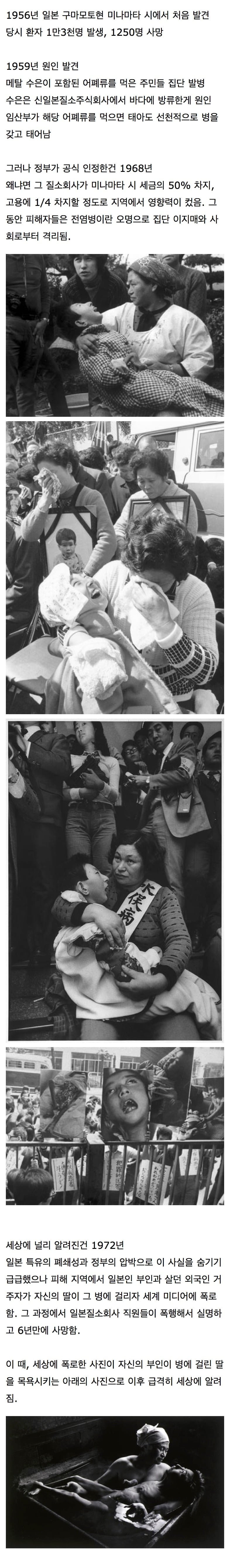 수은이 포함된 폐수를 마을 주민들이 섭취하면서 생긴 병이었는데, 이 폐수는 한 대기업인 신일본질소화학공업에서 바다로 방류된 것이었습니다. 수은에 오염된 어패류를 섭취한 주민들은 신경계 이상, 출산 문제 등 심각한 피해를 입었고, 이후 미나마타병이라는 이름으로 알려지게 되었습니다.