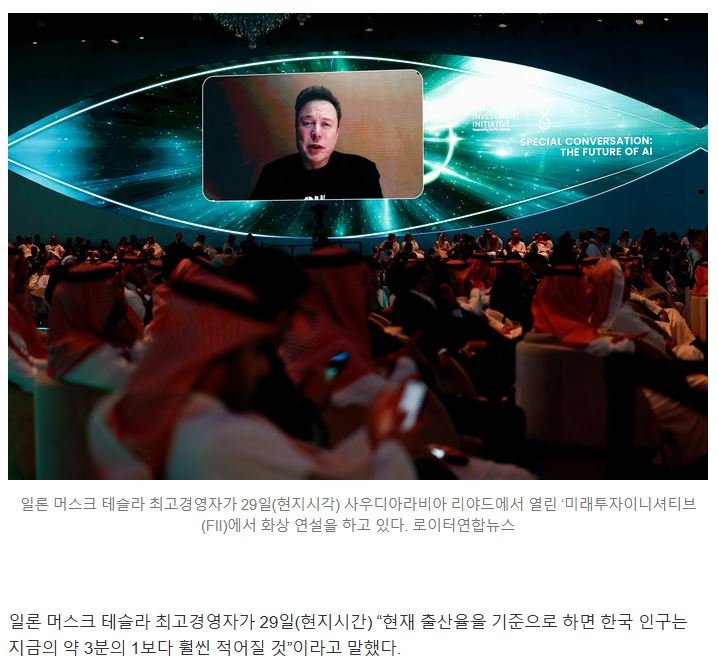 일론 머스크 테슬라 최고경영자가 29일(현지시간) “현재 출산율을 기준으로 하면 한국 인구는 지금의 약 3분의 1보다 훨씬 적어질 것”이라고 말했다. 머스크는 이날 사우디아라비아 리야드에서 열린 미래투자이니셔티브(F
