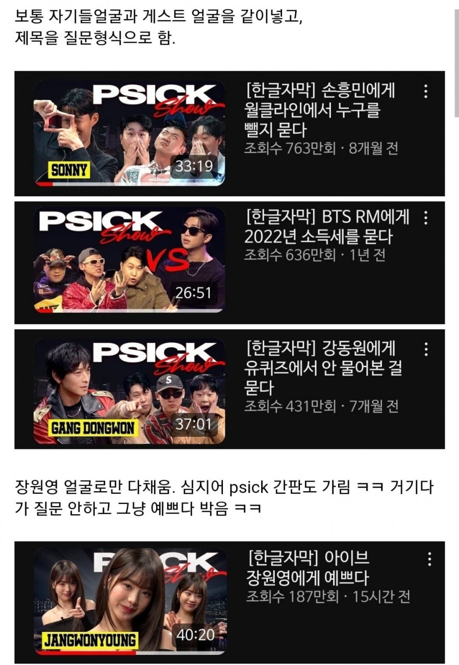 - 장원영이 나온 Psick Show 영상에서 제목에 질문조차 붙지 않았다는 건, 그녀의 비주얼만으로 이미 충분히 강력한 임팩트를 준다는 의미겠죠. 시청자들도 **"말 다 했지, 그냥 장원영이니까!"**라고 느끼는 듯.