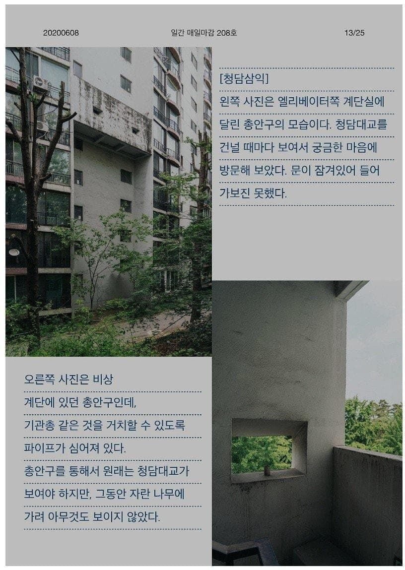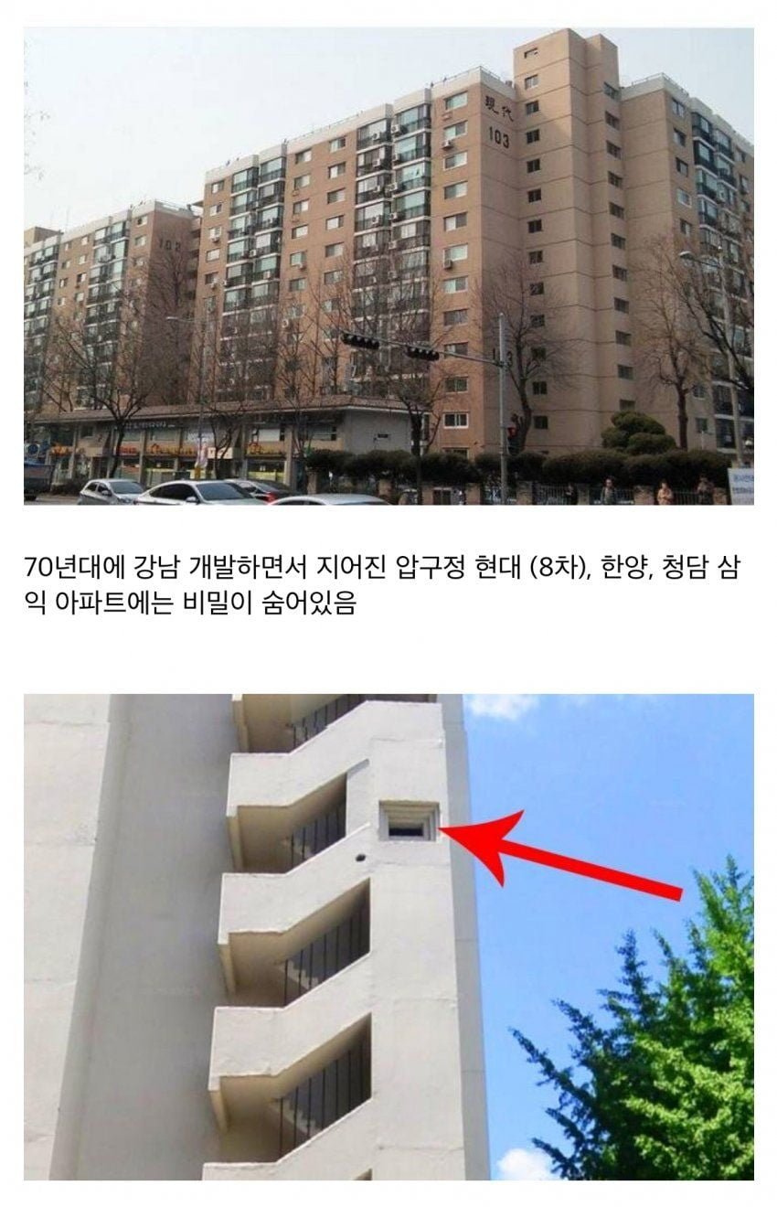 압구정 현대 아파트 외벽을 자세히 보면, 특이하게 창문이 없는 구조 속에 작은 창문이 하나씩 숨겨져 있는 것을 확인할 수 있습니다. 이 공간은 일반 세대와는 독립된 구조로, 긴급 상황 시 활용할 수 있는 대피 공간의 역할을 합니다.