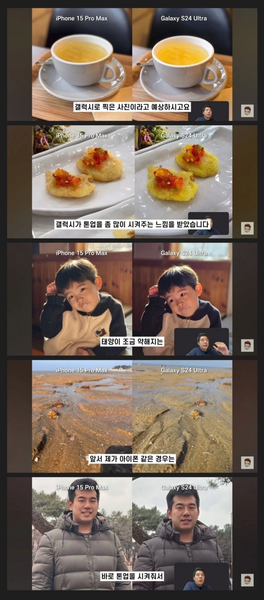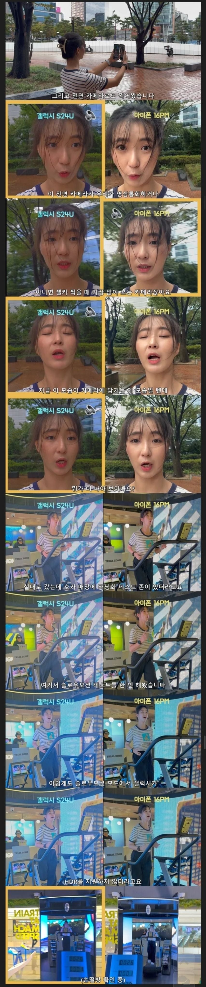 - 갤럭시는 AI 보정이 강해서 피부 톤을 강조하고 뽀얗게 보이게 하지만, 아이폰은 상대적으로 덜 보정돼 자연스럽게 보이는 경향이 있어요.