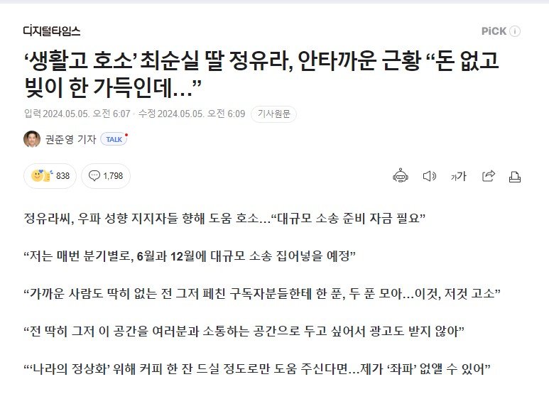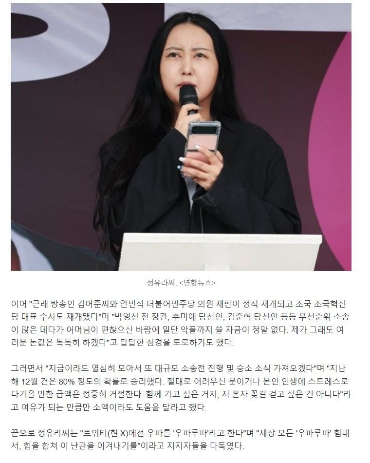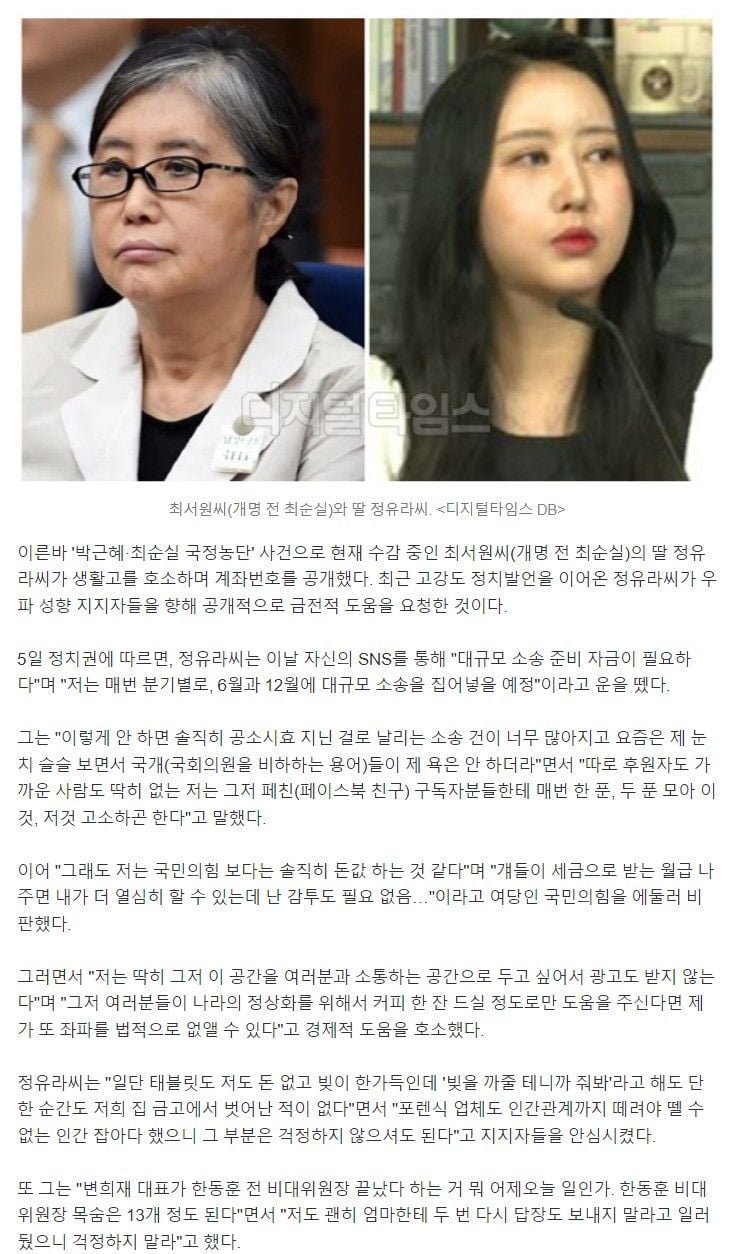 정유라씨, 우파 성향 지지자들 향해 도움 호소…“대규모 소송 준비 자금 필요” “저는 매번 분기별로, 6월과 12월에 대규모 소송 집어넣을 예정” “가까운 사람도 딱히 없는 전 그저 페친 구독자분들한테 한 푼, 두