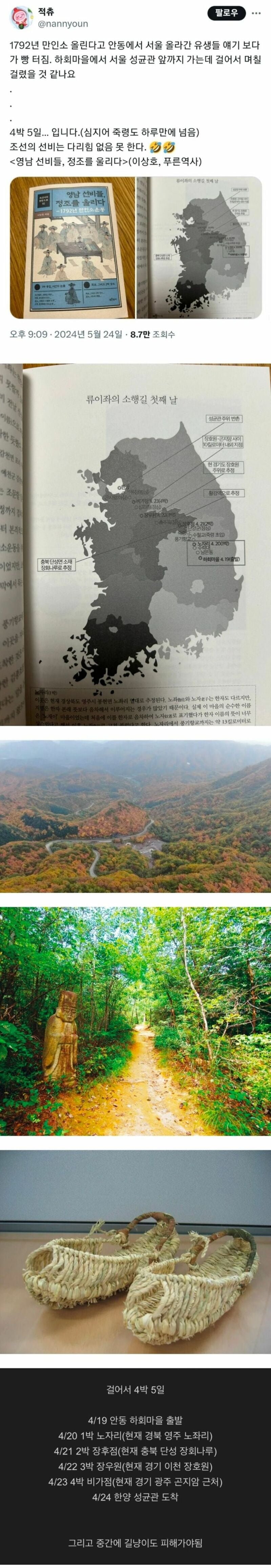 조선시대에는 오늘날과 같은 빠른 교통수단이 없었기 때문에, 장거리 이동은 상당한 시간과 노력이 필요했습니다. 안동에서 한양까지의 거리는 약 300km 정도로, 이 거리를 걸어서 이동한다고 가정하면 상당한 시간이 소요되었을 것입니다. 🏞️🛤️