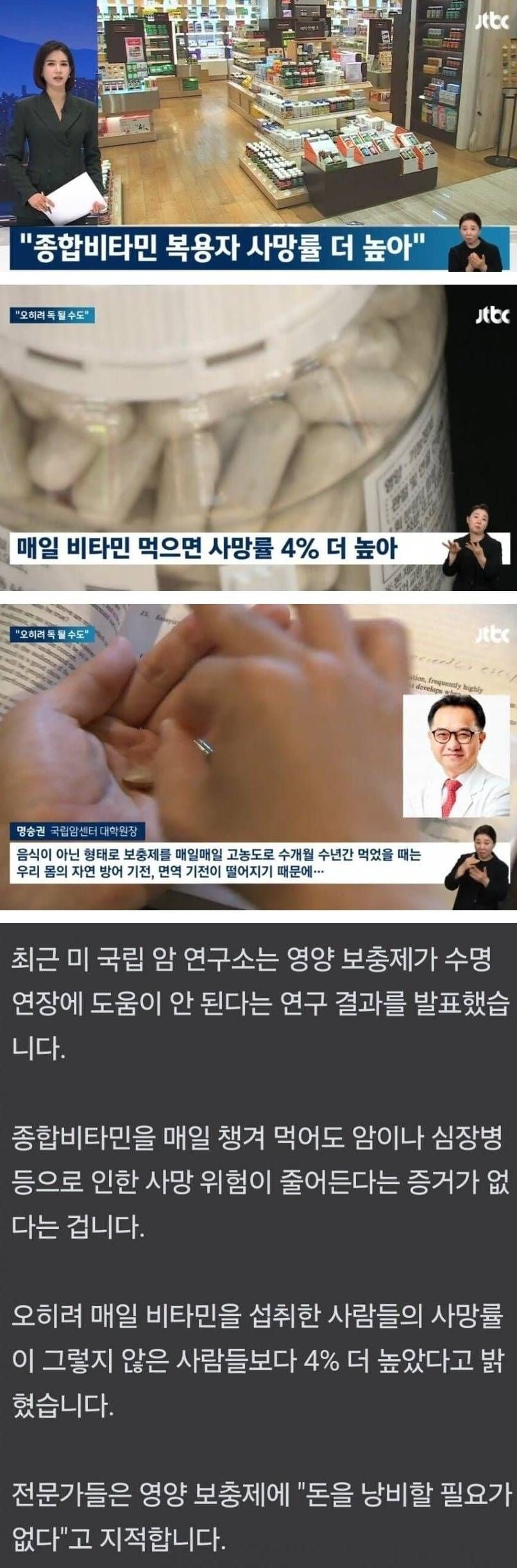 매일 종합비타민을 먹는 사람이 그렇지 않은 사람보다 사망률이 오히려 4% 더 높았다는 거죠. 😨