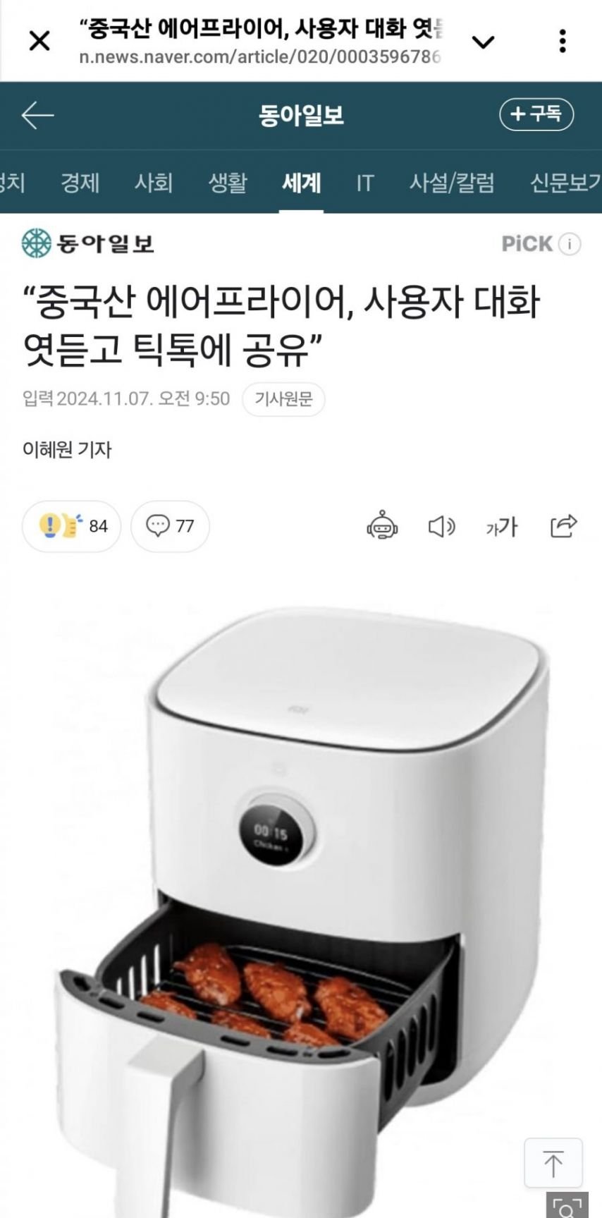 “중국산 에어프라이어, 사용자 대화 엿듣고 틱톡에 공유”