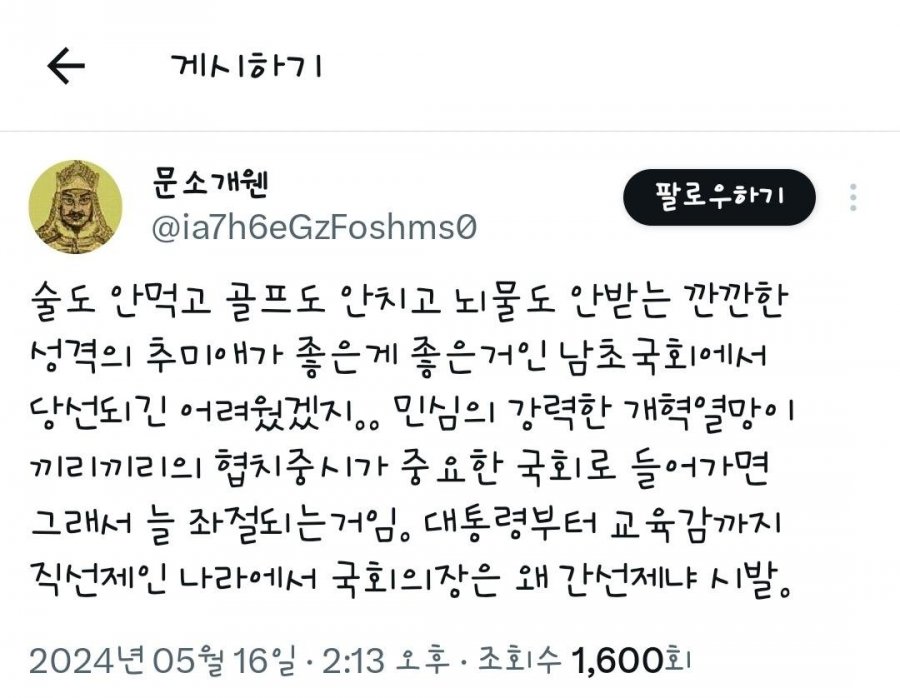 | 추미애 당선 안된 이유 ㄷㄷㄷ (1) | 2024.11.14 |