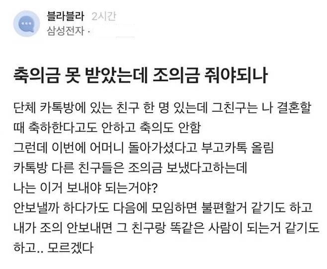 - 앞으로도 이 친구와 계속 어울려야 하고, 모임에서 마주칠 일이 많다면 조의금을 보내는 게 속 편할 수 있어요.