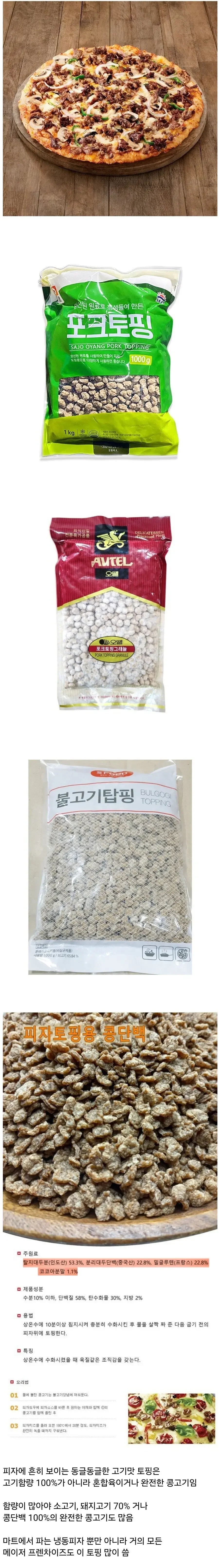 이미지에서 소개된 제품들을 보면, 그 정체는 **'혼합육' 혹은 '콩단백'**으로 만든 고기 모양 토핑들! 👀