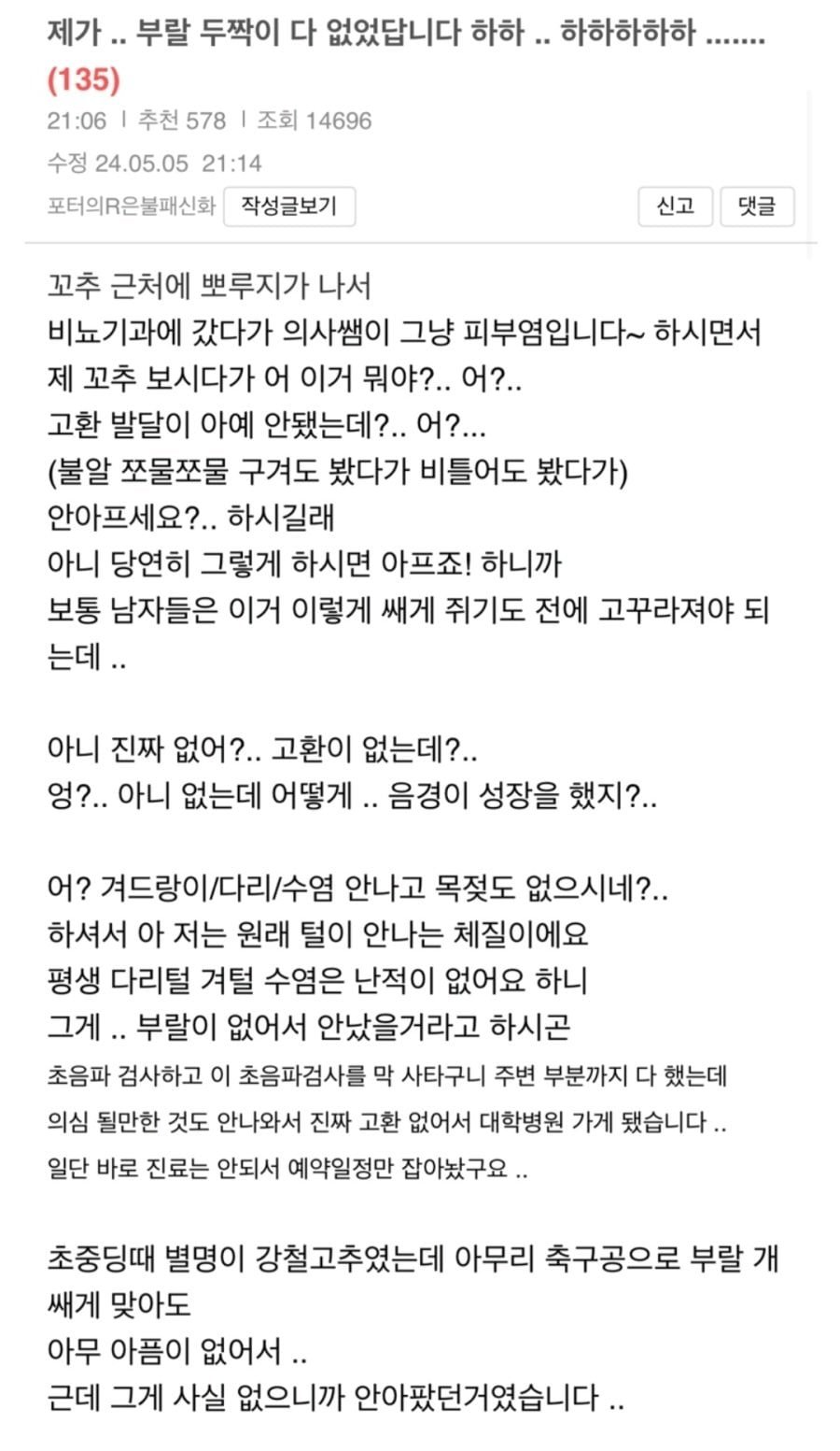 - 단순히 꼬추 주변 피부염으로 병원에 방문했다가 의사 선생님이 고환이 없다는 사실을 발견.