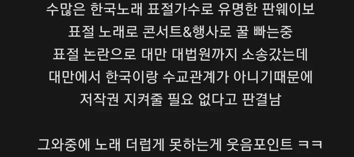 한때 한국 노래 표절로 유명했던 대만 가수 판웨이보가 여전히 논란의 중심에 있습니다. 🤔 그는 표절 노래로 각종 콘서트와 행사에서 큰 수익을 올렸지만, 표절 논란으로 대만 대법원까지 소송전이 이어졌죠.