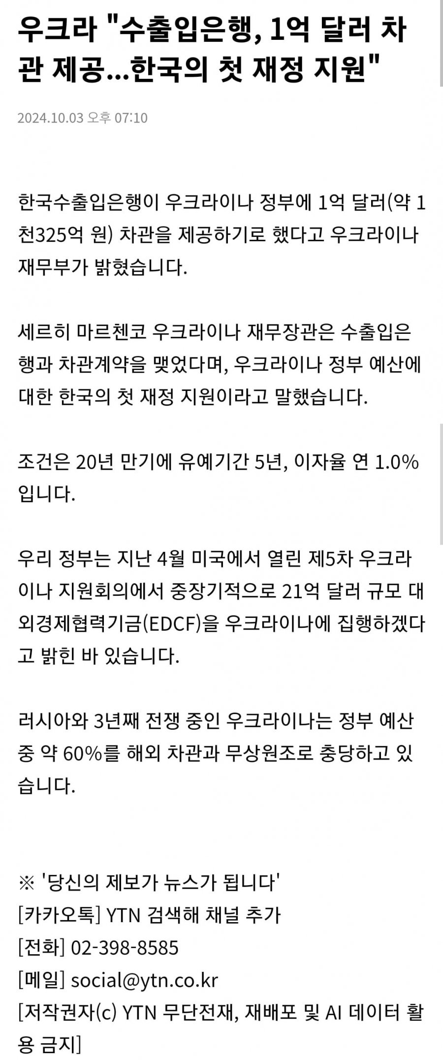 우크라 "수출입은행, 1억 달러 차관 제공...한국의 첫 재정 지원"