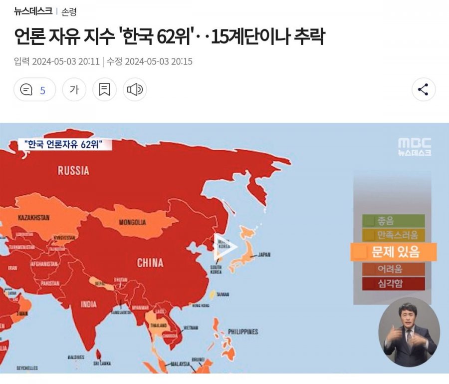 2024년 언론 자유 지수에서 한국이 62위를 기록하며 15계단이나 하락했습니다. 😢 전 세계적으로 "문제 있음" 등급으로 분류되며, 주변국과 비교해도 낮은 순위로 주목받고 있습니다.