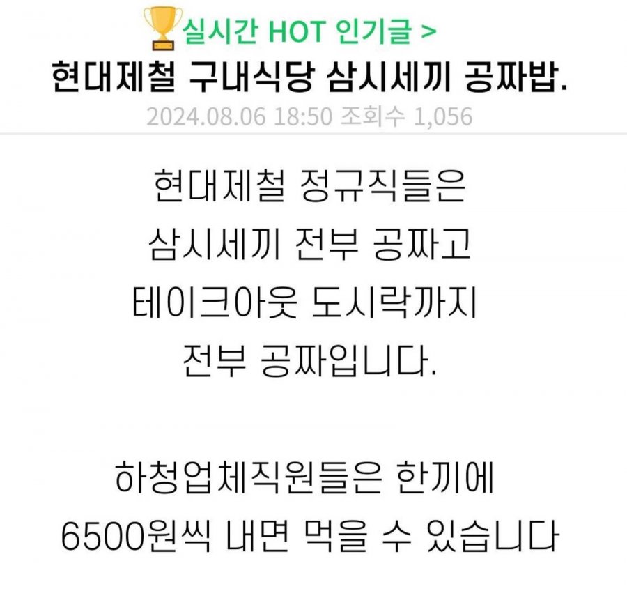 반면, 하청업체 직원들은 한 끼에 6,500원을 내야 먹을 수 있다고 해요. 같은 공간에서 일하지만 식사에 있어선 차이가 느껴지네요… 😢
