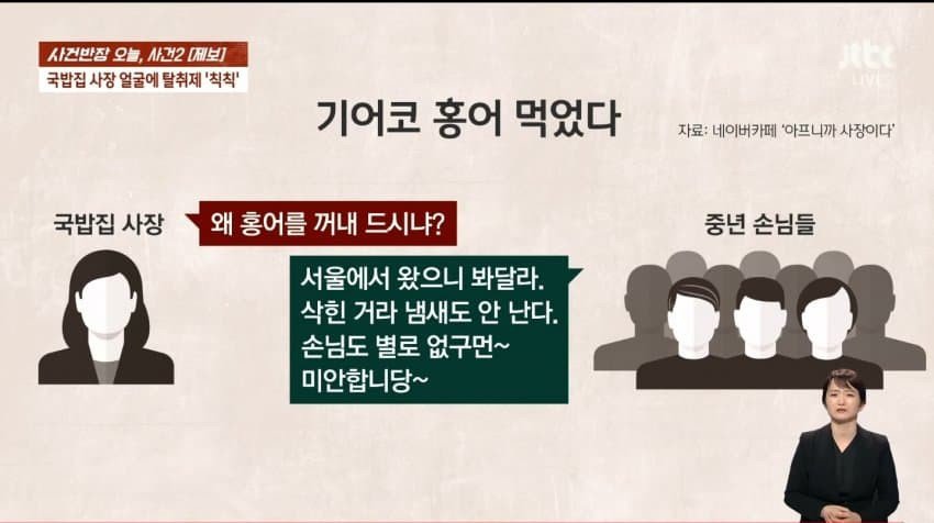 온라인에서는 "홍어를 들고 국밥집에서 먹는 건 예의가 아니다", "사장님 고생 많으셨다"는 응원이 이어졌다. 반면 일부는 "조금 더 융통성 있게 대처할 수도 있었던 것 아니냐"는 의견도 내놓으며 갑론을박이 펼쳐지고 있다.