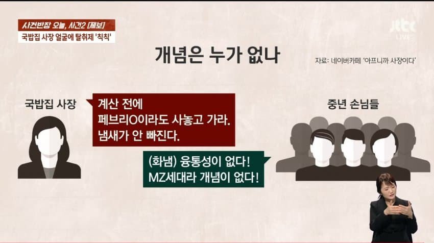 "요즘 젊은 세대가 융통성이 없다", "이 정도는 봐줄 수 있는 거 아니냐"며 되려 사장을 탓하는 태도를 보였다. 여기서 MZ 세대 vs 중년 세대 간의 세대 차이가 극명히 드러났다는 반응도 많다.