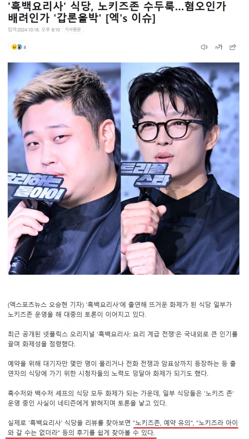 최근 넷플릭스 오리지널 흑백요리사가 공개되면서 화제가 된 식당들! 요리 경쟁과 더불어 프로그램의 인기가 폭발하면서, 실제로 해당 식당들을 방문하려는 사람들이 줄을 잇고 있습니다. 그런데 이 중 일부 식당이 노키즈존을 운영하고 있다는 사실이 알려지며 논란이 커지고 있네요.