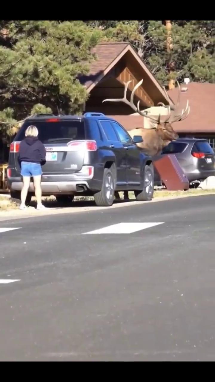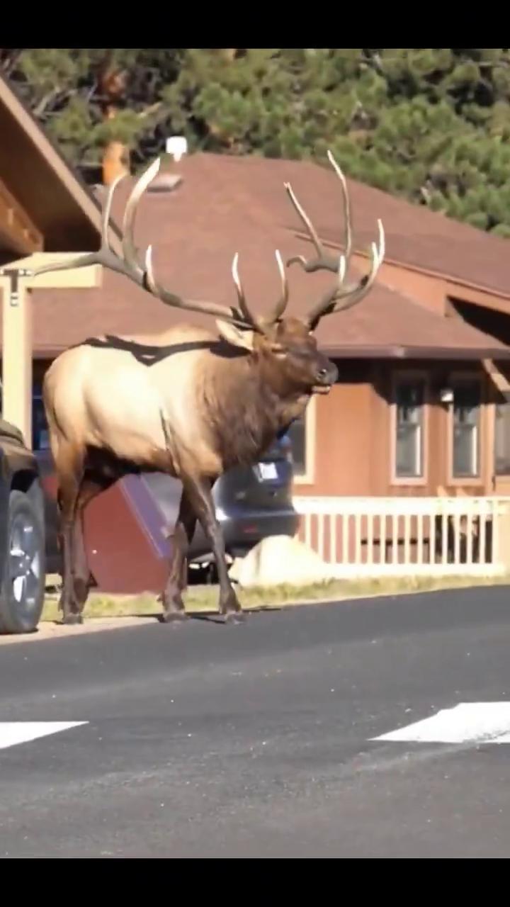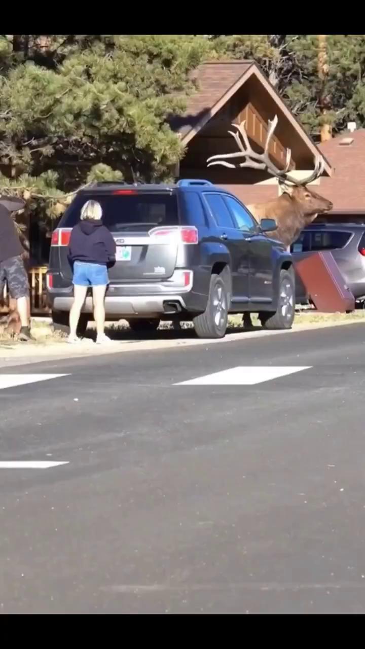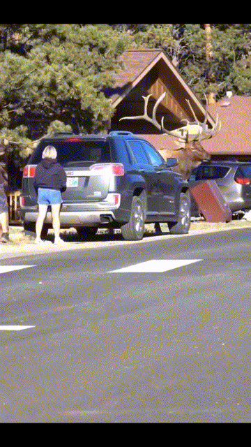 GIF 속 장면을 보면, 거대한 엘크(큰사슴) 한 마리가 도로 근처에 서 있는데요. 🚗🦌