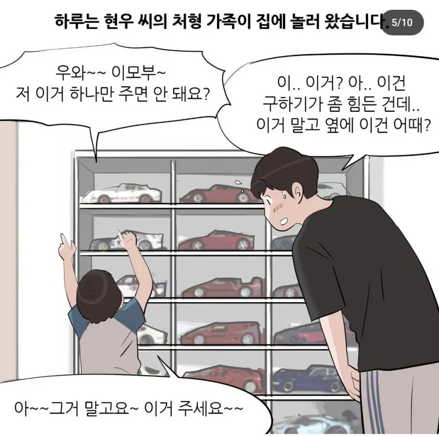 일러스트 속 현우 씨는 자동차 모형을 모으는 취미를 가지고 있어요.