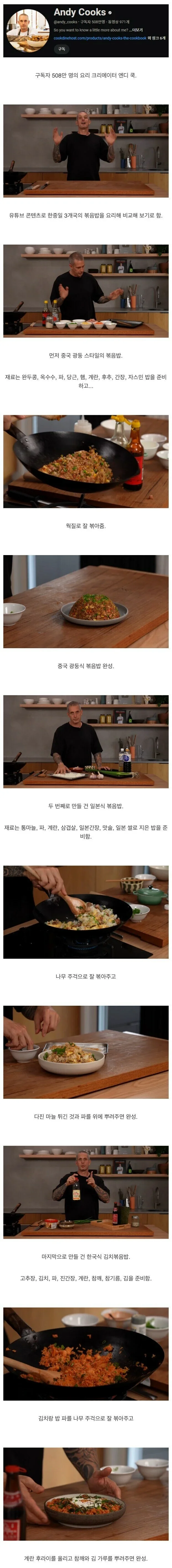 요리 유튜버 Andy Cooks님이 500만 구독자를 사로잡은 콘텐츠 하나를 공개했어요! 바로 한국, 중국, 일본 스타일 볶음밥 비교 🍳 삼국 볶음밥 대전이라니 벌써 군침이…🤤