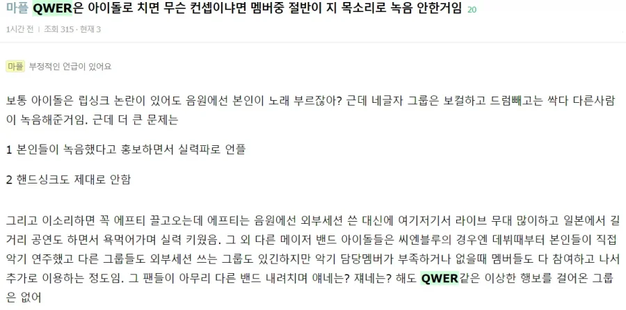- 일부 팬들은 QWER가 녹음된 음원으로 자신들의 실력을 과장 홍보하고 있다는 점을 지적했습니다.